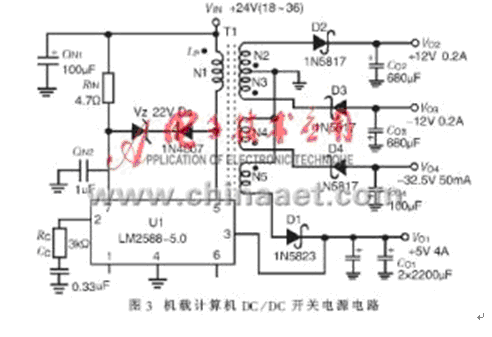 U1為控制器LM2588-5.0。脈沖變壓器T1共有五個(gè)繞組:N1為初級(jí)繞組,N2、N3、N4、N5為次級(jí)繞組,分別對(duì)應(yīng)輸出+12V@0.2A、-12V@0.2A、-32.5V@0.05A以及+5V@4A,且N2、N3圈數(shù)相同。