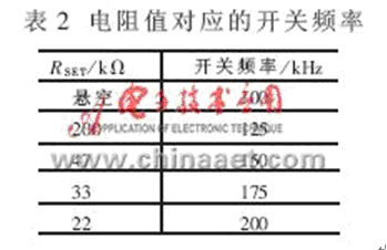 開關(guān)頻率可以通過外接電阻RSET在100kHz~200kHz之間調(diào)整,這個(gè)特點(diǎn)可以讓使用者根據(jù)工作頻率優(yōu)化磁存儲(chǔ)器以及電容器的尺寸、型號(hào)等。表2為不同的電阻值對(duì)應(yīng)的常用開關(guān)頻率。