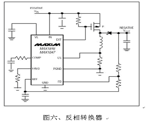 也可以選擇負(fù)電壓輸出轉(zhuǎn)換器, 圖六便是常用的PWM負(fù)壓轉(zhuǎn)換器, 外部元件少、設(shè)計(jì)簡(jiǎn)易, 工作在固定頻率的PWM結(jié)構(gòu)干擾較小。