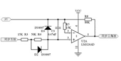 在如圖3所示的同步方波發(fā)生電路中,將工頻電壓同步取樣信號(hào)通過(guò)電阻 R7 加在運(yùn)算放大器I3的反相輸入端,與同相輸入端的+3V參考電壓進(jìn)行過(guò)零比較,那么運(yùn)算放大器的輸出端將得到脈沖寬度符合設(shè)計(jì)要求的方波電壓。