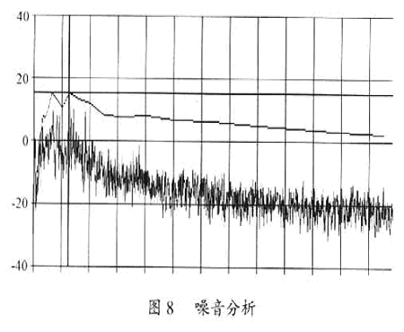 經(jīng)過以上電磁兼容性設(shè)計(jì),開關(guān)電源的輸出電壓調(diào)整率△V0/V0=O.12/12=l%,達(dá)到了預(yù)期設(shè)計(jì)要求。圖7是紋波電壓輸出圖,圖8是其工作時(shí)的噪音分析圖。