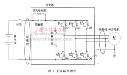 逆變器采用電壓源型主電路,直流側(cè)加支撐電容,附加直流繼電器和預(yù)充電電路。其電路圖如圖1所示。