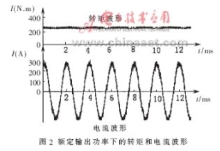 電機(jī)額定功率為57kW,額定轉(zhuǎn)矩為270N•m,額定轉(zhuǎn)速為2000r/min,額定端電壓為230V。變頻器系統(tǒng)參數(shù)根據(jù)使用的電機(jī)進(jìn)行匹配。在額定功率下運(yùn)行時的轉(zhuǎn)矩和電流波形如圖2所示。