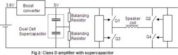 立體聲手機的峰值功率提高至2 x 5V2/8Ω = 6.25W,接近上述功率的兩倍。另外,因為超級電容能夠提供非常高的峰值電流,設計師可以使用4Ω的揚聲器將峰值音頻功率提高到12.5W,或4倍于最初的功率。