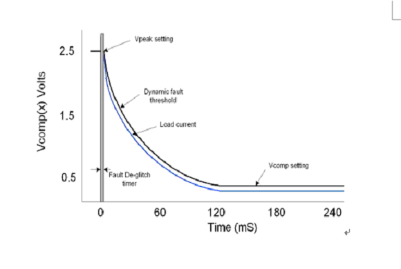 根據(jù)時(shí)間的變化對(duì)一個(gè)以電壓形式表示的過流故障閾值進(jìn)行調(diào)節(jié),以對(duì)燈泡燈絲電阻的變化進(jìn)行補(bǔ)償(如圖2所示 )。