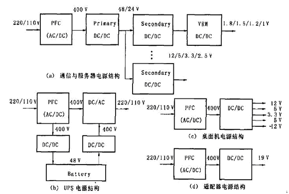 圖1(c)是桌面機(例如個人電腦)的電源結(jié)構(gòu)。先由PFC電路將市電變換成400V 的直流電壓,再經(jīng)過一個多路輸出的DC/DC 變換成多路的較低的直流電壓給不同負(fù)載供電。 圖1(d)是筆記本電腦適配器的電路結(jié)構(gòu)。 首先由PFC 將市電變換成400V的直流電壓,然后經(jīng)過一個DC/DC變換器降壓至19V(典型值)給負(fù)載供電。