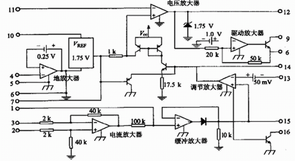 UC3907的內部結構如圖1所示??煞譃殡妷涵h(huán)與電流環(huán)(包括均流控制) 兩部分。其中電壓環(huán)由電壓放大器、接地放大器和驅動放大器構成。電流環(huán)由電流放大器、緩沖放大器、調節(jié)放大器和狀態(tài)指示構成。