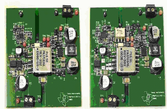 在高功率應(yīng)用中,越來(lái)越多的人選用有源鉗位正向轉(zhuǎn)換器。然而,只有極少數(shù)電源設(shè)計(jì)人員能夠意識(shí)到他們同樣可以在反向轉(zhuǎn)換器中使用有源鉗位。為了找出在反向拓?fù)浣Y(jié)構(gòu)中采用有源鉗位控制的益處,我們根據(jù)表 1 中的規(guī)范設(shè)計(jì)、構(gòu)建并測(cè)試了兩個(gè)電源。這兩個(gè)電源均使用次級(jí)同步整流,但是其中一個(gè)使用電源變壓器來(lái)驅(qū)動(dòng)同步 FET,另一個(gè)則使用一個(gè)柵極驅(qū)動(dòng)變壓器并且還采用了一個(gè)有源鉗位。POE 輸入要求產(chǎn)生了許多規(guī)范,但是我們可以擴(kuò)大其輸入范圍以實(shí)現(xiàn)在電信領(lǐng)域的應(yīng)用。為了公平比較起見(jiàn),我們使主要組件不受該兩種設(shè)計(jì)中使用兩種完全一致的方法所產(chǎn)生的不同差異的影響,圖 1 給出了每個(gè)電路的圖片。我們還需使兩個(gè)電路板中組件的安放位置和布局一樣。在這兩個(gè)電路中,最值得注意的不同點(diǎn)是有源鉗位電路中柵極驅(qū)動(dòng)變壓器的添加。