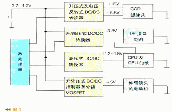 數(shù)碼相機中有三種電源:系統(tǒng)電源、LCD電源以及白光LED驅動電源(背光照明及閃光燈電源)。系統(tǒng)電源部分由4個DC/DC轉換器組成,如圖3所示。它分別給CCD攝像頭、I/F接口電路、CPU的核及伸縮鏡頭的電動機供電,通過微處理器可做負載管理,微處理器也可以根據(jù)工作狀態(tài)要求來控制LCD背光亮度及閃光燈驅動電路。