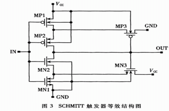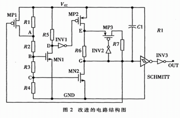 改進(jìn)的電路如圖2所示,電路結(jié)構(gòu)由采樣、先導(dǎo)控制、比較器、遲滯反饋回路、加速響應(yīng)電路、緩沖器六部分構(gòu)成。電阻R1、R2、R3、R4構(gòu)成分壓電阻網(wǎng)絡(luò)實(shí)現(xiàn)對(duì)Vcc的采樣;MNl、R5、INVl組成先導(dǎo)控制電路,實(shí)現(xiàn)對(duì)比較器灌電流的控制;MN2、R6、MP2組成比較器,實(shí)現(xiàn)采樣電壓與MN2的VTH比較;MP1構(gòu)成正反饋回路,可實(shí)現(xiàn)Vcc的遲滯功能;INV2、MP3、R7構(gòu)成正反饋回路,可加速比較器的翻轉(zhuǎn),從而提高電路的響應(yīng)速度;SCHMITT觸發(fā)器和INV3是緩沖電路,對(duì)比較器的輸出波形進(jìn)行緩沖和整形,SCHMITT觸發(fā)器的結(jié)構(gòu)如圖3所示,其工作原理詳見(jiàn)參考文獻(xiàn)[3];另外,電容C1起濾波和儲(chǔ)能作用。