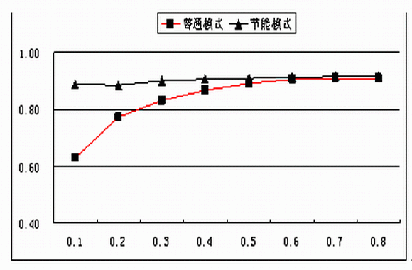 針對(duì)電源部分的損耗,戶外電源的工作模式和室內(nèi)電源是一樣的,正常情況下為均流工作模式。市電正常時(shí)模塊負(fù)載率較低,電源系統(tǒng)大多數(shù)沒有工作在系統(tǒng)最佳效率區(qū)間,因此可以采用電源模塊休眠技術(shù)根據(jù)系統(tǒng)負(fù)載狀態(tài),動(dòng)態(tài)調(diào)整工作模塊數(shù)量,使系統(tǒng)始終工作在最佳效率區(qū)間,從而降低系統(tǒng)的能耗。圖1表示了電源系統(tǒng)在普通工作模式下和節(jié)能模式下的系統(tǒng)典型效率比較。從圖1可看出,采用休眠節(jié)能模式,電源系統(tǒng)的效率在整個(gè)負(fù)載范圍內(nèi)基本保持不變,有效的降低了電源系統(tǒng)在低負(fù)載條件下的能耗。另一方面,對(duì)于戶外電源來說,電源系統(tǒng)效率提高會(huì)降低設(shè)備倉的發(fā)熱量,降低設(shè)備倉的溫度。