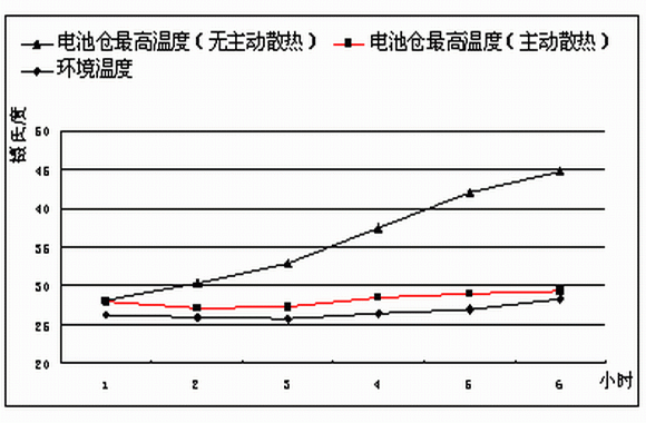 因此戶外電源設(shè)計(jì)中針對(duì)電池倉的環(huán)境控制非常關(guān)鍵。尤其在高溫環(huán)境中要有針對(duì)性的散熱措施,研究表明,傳統(tǒng)的自然開孔散熱難以滿足電池的應(yīng)用要求。在傳統(tǒng)的自然開孔散熱條件下,雖然蓄電池自身發(fā)熱量較小,但隨著環(huán)境溫度的升高,在蓄電池倉中的熱累積會(huì)逐步的升高電池倉的溫度,在太陽照射的條件下情況更為嚴(yán)重。如圖6所示,在自然散熱條件下(倉內(nèi)無主動(dòng)散熱措施),電池倉內(nèi)溫度會(huì)遠(yuǎn)高于環(huán)境溫度。在同樣的條件下,采用主動(dòng)散熱技術(shù),電池倉內(nèi)溫度基本接近于環(huán)境溫度,電池工作條件會(huì)得到極大改善。根據(jù)此項(xiàng)研究結(jié)果,艾默生開發(fā)了電池倉獨(dú)立風(fēng)道散熱技術(shù),保證了電池倉的充分散熱,極大的改善了電池工作溫度,提高了電池壽命。