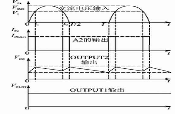 VB409采取的是導(dǎo)通角技術(shù),即在交流電的一個周期中,根據(jù)負(fù)載的電流大小,自動調(diào)整每個周期的導(dǎo)通時間。也就是說,只在每個正周期的低壓部分,從電源吸收電能,因此極大地降低了功耗,電流輸出能力是線性電源的3倍。其工作波形如圖2所示。