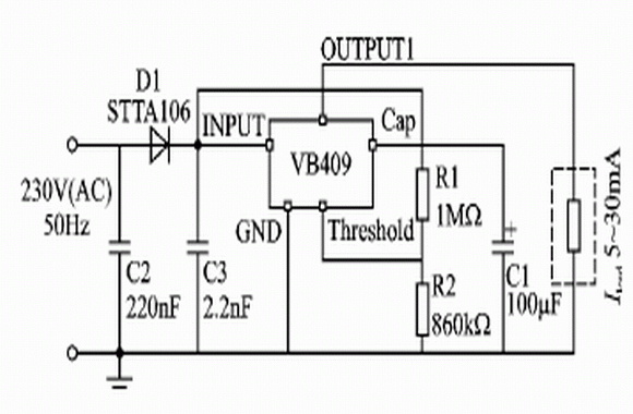 在小型的MCU應(yīng)用系統(tǒng)中,采用AC 220V供電時,一般要使用變壓器對電源進(jìn)行處理,將高壓交流電降到低壓后再進(jìn)行直流處理,或者將交流電變?yōu)楦邏褐绷麟姾笤龠M(jìn)行高頻變換,以得到MCU系統(tǒng)的工作電源。這對于結(jié)構(gòu)沒有特殊要求的系統(tǒng),在設(shè)計上屬于常規(guī)的問題,使用上述的線性電源技術(shù)或者開關(guān)電源技術(shù),均能得到方便的解決。但是有些MCU應(yīng)用系統(tǒng)在體積上要求極其小巧,甚至不能安放變壓器,所以常規(guī)的電源處理就不能滿足其要求了。因此,使用能夠直接接收高壓交流電并將其直接變換成低壓直流的技術(shù),是最佳的設(shè)計選擇。VB409的出現(xiàn)有望實現(xiàn)這一設(shè)計思路。