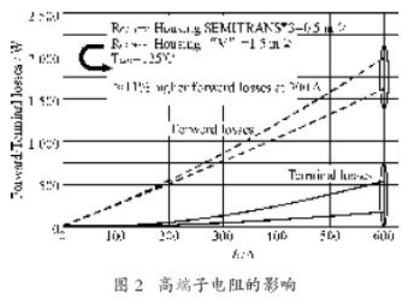 模塊的端子電阻對電路的工作效率的影響如圖2所示。在圖2所示的例子中,舉例的開關導通損耗比SEMITRANS高11%。這相當于一個每相絕對值約90 W,三相共270 W的功率變頻器。