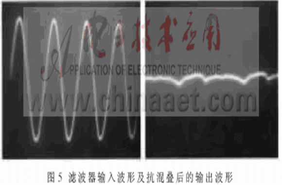 實(shí)驗(yàn)觀察得知,經(jīng)過開關(guān)電容濾波后的信號存在較多的“毛刺”和“陰影”。分析發(fā)現(xiàn),這主要是高頻混疊所致。本文作者通過大量的實(shí)驗(yàn)探索提出了在開關(guān)電容帶阻濾波電路的輸出端接入抗混疊濾波器的精簡解決方法,采用一階低通濾波器實(shí)現(xiàn)抗混疊濾波。同時(shí),接入的抗混疊濾波器還起到消除開關(guān)噪聲、時(shí)鐘噪聲等高頻干擾和平滑濾波的目的。濾波器輸入波形及輸出波形如圖5所示。