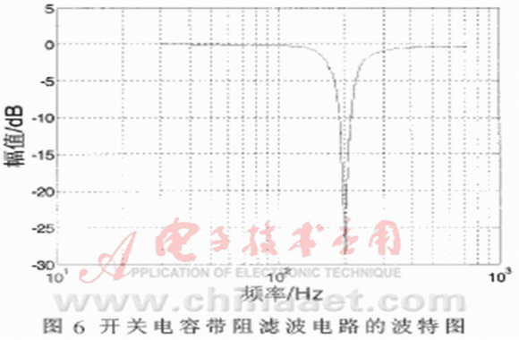 根據(jù)實(shí)驗(yàn)數(shù)據(jù)繪制的開關(guān)電容帶阻濾波器的波特圖如圖6所示。