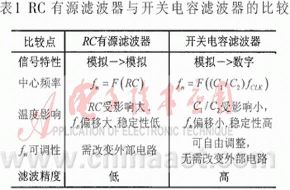 開關(guān)電容濾波器與RC有源濾波器比較如表1所示。傳統(tǒng)濾波器的中心頻率與電阻和電容有關(guān),兩者的微小變化都會(huì)引起中心頻率出現(xiàn)較大偏移。開關(guān)電容濾波器可以自由調(diào)整中心頻率,且當(dāng)電容值隨溫度發(fā)生漂移時(shí),兩個(gè)電容值同向改變,維持了電容比值的穩(wěn)定,使得中心頻率具有很高的溫度穩(wěn)定性。