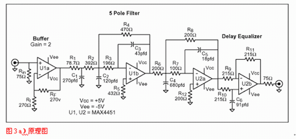 使用軟件或歸一化曲線,我們會發(fā)現-3dB帶寬為8.45MHz的5極點Butterworth濾波器就能滿足選擇性要求,但沒考慮群延時。對于后者,需要一個延時級,對于此電路,需要重點關注的運放參數為0.1dB,2VP-P帶寬。將該數值應用于式1和2可獲得精確的設計。圖3a與3b給出了一個適合此類應用的原理圖,并用曲線顯示了它的增益和群延時特性,此設計基于四倍過采樣系統(tǒng)。由于MAX4450/4451卓越的瞬態(tài)響應與大信號帶寬(2VP-P時175MHz),因此選擇它。