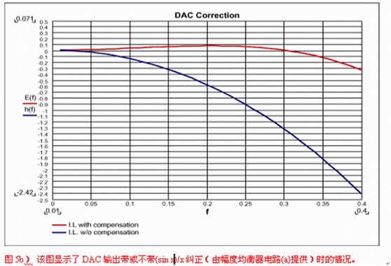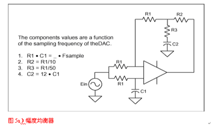 DAC之后的重建濾波是沒有被很好理解的應用之一。很多設計者認為引入重建濾波器是為了濾掉采樣時鐘,但這遠不是事實。當信號被采樣時,采樣中包含了多個重復的信號映像,分別對準采樣時鐘的各次諧波。重建濾波器將濾掉除基帶采樣外的所有其他信號。如果抗混疊濾波器達到了其目的,那么DAC輸出看上去就像圖4中的映像A,接下來,它右邊的所有采樣都應被濾掉。因此,對于重建的要求類似于抗混疊,但是,由于每個采樣只停留瞬間,DAC會將每個采樣保持一個時鐘周期,這樣一來,就產生了我們所熟悉的逼近于某斜線的臺階狀波形。保持功能相當于一個數字濾波器,它的特性類似于Butterworth或Bessel濾波器,在半采樣頻率處響應被降低了4dB。重建濾波器的第二個目的是補償這個損失,這就需要如圖5a電路那樣的幅度均衡器。該均衡器在一個延時電路的基礎上構成,具有類似于Bessel濾波器的響應。它可按照DAC采樣率(FS)來設計。圖5b顯示了采用和未用幅度均衡器時的DAC頻率響應。與延時級類似,它可以被包含在任何重建濾波器中。