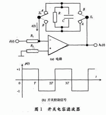 開關(guān)電容有源濾波器電路如圖1(a),其中S1和S2是由周期為2T的方波信號(hào)控制的理想電子開關(guān),方波控制信號(hào)p(t)波形如圖1(b),其占空系數(shù)為0.5。即在2kT<t<(2K+1)T期間兩開關(guān)接通A點(diǎn),在(2K+1)T<t<(2K+2)T期間兩開關(guān)接通B點(diǎn),其中K=0,1,2,…,是時(shí)段編號(hào)。