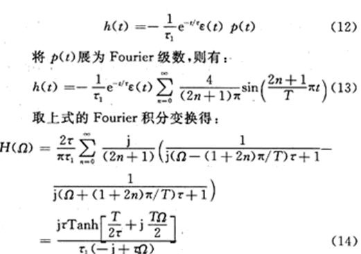 特別注意,求和式是一周期為2T的周期方波p(t)與單位階躍信號(hào)ε(t)的乘積,對(duì)上式取Fourier積分變換即得到開關(guān)電容電路系統(tǒng)頻譜函數(shù)(用j表示虛數(shù)單位,下同):