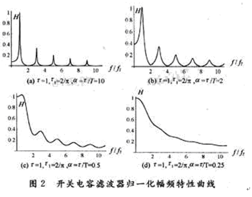 (1)α=τ/T較大時(shí)電路是梳齒幅度按奇數(shù)倒數(shù)規(guī)律衰減的梳狀濾波器,通帶中心頻率(梳齒)為: