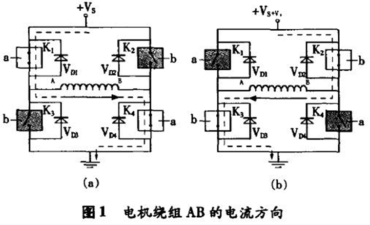 4個開關(guān)K1和K4,K2和K3分別受控制信號a,b的控制,當(dāng)控制信號使開關(guān)K1,K4合上,K2,K3斷開時,電流在線圈中的流向如圖1(a),當(dāng)控制信號使開關(guān)K2,K3合上,K1,K4斷開時,電流在線圈中的流向如圖1(b)所示。4個二極管VD1,VD2,VD3,VD4為續(xù)流二極管,它們所起的作用是:以圖1(a)為例,當(dāng)K1,K4開關(guān)受控制由閉合轉(zhuǎn)向斷開時,由于此時線圈繞組AB上的電流不能突變,仍需按原電流方向流動(即A→B),此時由VD3,VD2來提供回路。因此,電流在K1,K4關(guān)斷的瞬間由地→VD3→線圈繞組AB→VD2→電源+Vs形成續(xù)流回路。同理,在圖1(b)中,當(dāng)開關(guān)K2,K3關(guān)斷的瞬間,由二極管VD4,VD1提供線圈繞組的續(xù)流,電流回路為地→VD4→線圈繞組BA→VD1→電源+Vs。步進電機驅(qū)動器中,實現(xiàn)上述開關(guān)功能的