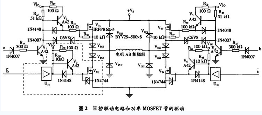 在圖2中,功率MOSFET管VT1,VT2,VT3,VT4和續(xù)流二極管 VD11,VD19,VD14,VD22相當(dāng)于圖1中的K1,K2,K3,K4和VD1,VD2,VD3,VD4。功率MOSFET管的控制信號是由TTL邏輯電平a,a,b,b來提供的,其中a與a,b與b在邏輯上互反。
