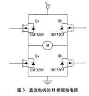 直流電動機是EPS系統(tǒng)的執(zhí)行元件,電機的控制電路在系統(tǒng)設計中有著特殊的地位。在本系統(tǒng)中采用脈寬調制(PWM)控制H橋電路實施對直流電動機的控制,由4個功率MOSFET組成,如圖3所示。采用PWM伺服控制方式,MOSFET功率管的驅動電路簡單,工作頻率高,可工作在上百千赫的開關狀態(tài)下。系統(tǒng)采用4個International Reetifier公司生產的IRF3205型MOSFET功率管組成H橋路的4個臂。IRF3205具有8 mΩ導通電阻、功耗小、耐壓達55V、最大直流電流110A、滿足EPS系統(tǒng)對MOSFET功率管低壓(正常工作不超過15V)大電流(額定電流30 A)的要求。
