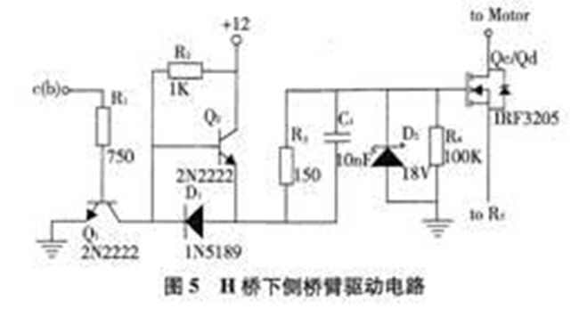 當MOSFET的控制信號c(d)低電平時, Q1截止,Q2導通,電源通過Q2以及R3與C,組成的并聯(lián)電路對Qc的柵極充電,直至Qc完全導通。當Qc導通時,其柵—源極電壓等于電源電壓減去Q2的集—射極飽和導通電壓,而電源電壓又等于蓄電池電壓減去1N5819二極管的正向導通電壓。所以,Qc的柵—源極電壓VGS=(Vbat-VCE-VF),當蓄電池電壓為12V,取各參數為典型值得Qc的柵-源極電壓為11.26V,滿足IRF3205的柵極驅動(10V)所需的電壓。