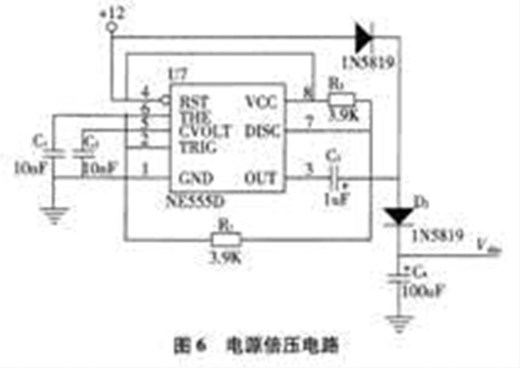 電源倍壓電路如圖6所示,NE555定時器工作于多諧振蕩器模式,于引腳3產生幅值等于NE555的供電電壓,頻率為1/0.7(R2+2R1)C1的矩形波。C3、C4,Dl和D2構成電荷泵電路。當NE555引腳3輸出高電平時,由于電容電壓不能突變,C3正極電壓為24V或接近24V,并通過D2向C4充電,使C4電壓為24V或接近24V。由于受電路的工作效率、二極管D1和D2上的正向電壓降以及負載能力的限制,使得系統(tǒng)輸出電壓低于供電電壓的2倍,即供電電壓為12V時,輸出電壓低于24V,當供電電源為12V時,倍壓電源電壓約為22.9V,大于Vdb1(22.74V),可以滿足需要。