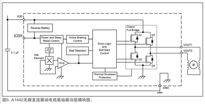 A1442是驅(qū)動(dòng)馬達(dá)唯一必須的的IC。圖5所示的功能模塊圖說(shuō)明了設(shè)備運(yùn)行和先進(jìn)的特性。注意圖4和圖5中,采用集成的霍爾傳感器免除了外部霍爾傳感器,從而減少了馬達(dá)PCB元件數(shù)量。唯一所需的外部元件是一種標(biāo)準(zhǔn)電路特性——位于應(yīng)用馬達(dá)安裝PCB上的0.1µF的旁路電容,它用于降低在開關(guān)電源的電感負(fù)載時(shí)產(chǎn)生的瞬時(shí)電壓峰值。