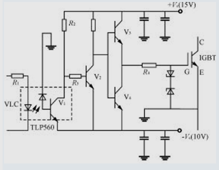 圖3為采用光耦合器等分立元器件構成的IGBT驅動電路。當輸入控制信號時,光耦VLC導通,晶體管V2截止,V3導通輸出+15V驅動電壓。當輸入控制信號為零時,VLC截止,V2、V4導通,輸出-10V電壓。+15V和-10V電源需靠近驅動電路,驅動電路輸出端及電源地端至IGBT柵極和發(fā)射極的引線應采用雙絞線,長度最好不超過0.5m。