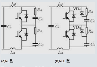 為了使IGBT關斷過電壓能得到有效的抑制并減小關斷損耗,通常都需要給IGBT主電路設置關斷緩沖吸收電路。IGBT的關斷緩沖吸收電路分為充放電型和放電阻止型。充放電型有RC吸收和RCD吸收2種。如圖6所示。