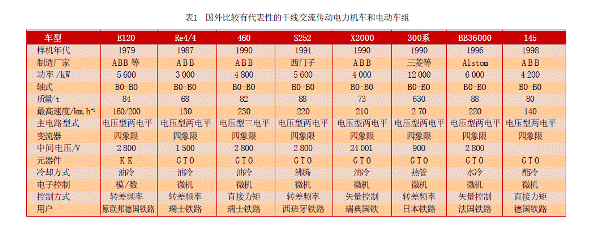 [page]20世紀(jì)70年代以來,電力電子學(xué)和微電子技術(shù)的出現(xiàn)和進(jìn)步,又重新喚起人們對交流傳動系統(tǒng)的熱情。自1971年世界首臺采用異步交流傳動系統(tǒng)的內(nèi)燃機(jī)車DE2500問世以來,交流傳動系統(tǒng)以其突出的優(yōu)越性受到了各國鐵路運(yùn)輸部門的關(guān)注,獲得了長足的發(fā)展,并已基本取代了直流傳動系統(tǒng)。與直流傳動機(jī)車相比,交流傳動具有無可比擬的優(yōu)越性,這已經(jīng)在各國鐵路運(yùn)輸系統(tǒng)中得到了廣泛的驗證。交流傳動所用的三相交流異步電動機(jī)比直流電動機(jī)的功率/體積比和功率/重量比更大,無需經(jīng)常維護(hù),故障率低。異步電動機(jī)的恒功率區(qū)比直流電動機(jī)大許多,轉(zhuǎn)速更高,起動牽引力大,持續(xù)功率大,有利于實(shí)現(xiàn)重載和高速牽引。交流傳動可以很容易地實(shí)現(xiàn)電氣制動,大大減少制動閘瓦的消耗,并可以利用制動時反饋的能量,起到節(jié)能節(jié)油的作用,經(jīng)濟(jì)效益顯著。另外,交流傳動機(jī)車的一個突出的優(yōu)點(diǎn)在于其優(yōu)良的粘著特性,由于異步交流電動機(jī)變頻調(diào)速系統(tǒng)具有很硬的機(jī)械特性,車輪更不容易打滑或者空轉(zhuǎn)。其次,交流傳動電力機(jī)車牽引和再生工況的功率因數(shù)均接近于1,不僅降低了電網(wǎng)損耗而且在再生制動時可將高質(zhì)量電能反饋給電網(wǎng),消除了電網(wǎng)對信號和通信系統(tǒng)的干擾。再者,機(jī)車采用交流牽引電動機(jī)后,簧下重量大大減輕,改善了輪軌動力學(xué)性能,降低了機(jī)車輪緣磨耗。隨著磁場定向矢量控制和直接轉(zhuǎn)矩控制等高性能異步電動機(jī)控制策略的應(yīng)用,交流傳動機(jī)車的調(diào)速性能已經(jīng)能夠達(dá)到甚至超過直流傳動機(jī)車。表1是國外比較有代表性的使用交流傳動的電力機(jī)車和電動車組。