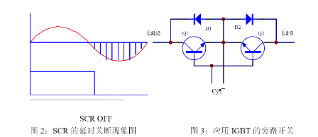 旁路開關(guān)常使用繼電器和可控硅。繼電器在中小功率的UPS 中廣泛應用。優(yōu)點是控制簡單,成本低,缺點是繼電器有轉(zhuǎn)換時間,還有就是機電器件的壽命問題??煽毓璩R娪谥写蠊β蔝PS 中。優(yōu)點是控制電流大,沒有切換時間。但缺點就是控制復雜,且由于可控硅的觸發(fā)工作特性,在觸發(fā)導通后要在反向偏置后才能關(guān)斷,這樣就會產(chǎn)生一個最大10ms 的環(huán)流電流,如圖2。如果采用IGBT,如圖3,則可以避免這個問題,使用IGBT 有控制簡單的優(yōu)點,但成本較高。其工作原理為:當輸入為正半周時,電流流經(jīng)Q1、D2,負半周時電流流經(jīng)D1、Q2。
