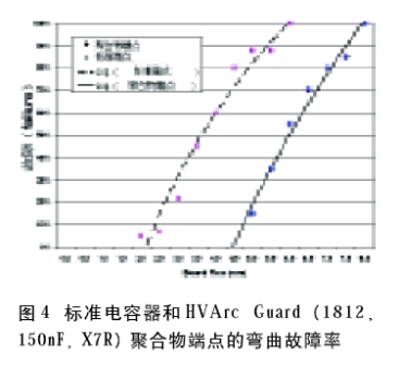 如同在前一部分中提到的那樣,焊接引線和涂層已廣泛用于生產(chǎn)高壓元件。除了引線外,引線框也可以用來封裝多個電容器,以得到更高的容量和增加符合性。盡管增加一個鷗翼型引線框會顯著增加元件的成本,但是它可以避免電路板彎曲的發(fā)生。直到最近,都沒有有效的方法來增加表面貼裝器件端點的符合性,但這個歷史已經(jīng)一去不復返了。通過在環(huán)氧聚合物端點上加上銀,可以防止電路板彎曲時發(fā)生的故障,進而增加可靠性。這種選擇目前已用于我們的OMD-Cap范圍高壓系列設計以及HVArc Guard電容器。當電路板彎曲時,標準電容器與相同HVArc Guard電容器的聚合物端點的測試顯示的故障率差異如圖4所示。
