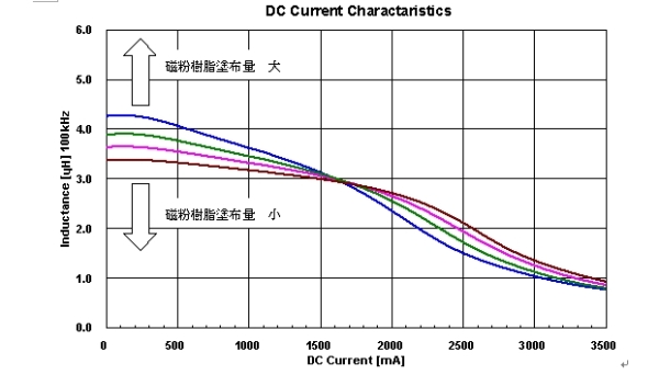 LQH55P_R0系列在卷線周圍全部涂有磁性樹脂,從而提高磁屏蔽,這樣做能夠獲得更低的直流電阻值。另外,由精密的涂層技術(shù)控制磁性樹脂的涂量,從而調(diào)節(jié)實(shí)際有效的μ并控制所需要的感值和直流偏置特性。圖5中表示了磁性樹脂涂量變化時的直流偏置特性。精密磁性樹脂涂層技術(shù)使較大電流時可維持最低限度的感值,以及減少初期感值低下等直流偏置特性可以得到自由控制。