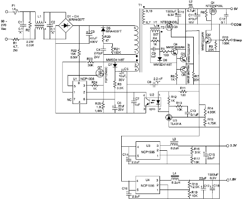本文介紹的參考設(shè)計(jì)采用通用交流輸入,提供5.0 V、3.3 V和1.8 V輸出,能效高于72%。只要簡單改變3.3 V和1.8 V輸出上的檢測網(wǎng)絡(luò),也可以提供其它輸出電壓。如果需要“休眠模式”的話,該設(shè)計(jì)也提供抑制5 V輸出的選項(xiàng)。此電源的主轉(zhuǎn)換器使用安森美半導(dǎo)體的NCP1308電流模式控制器及1個(gè)外部MOSFET,采用準(zhǔn)諧振(QR)反激拓?fù)浣Y(jié)構(gòu)設(shè)計(jì)。5 V輸出采用1個(gè)同步整流MOSFET,而2個(gè)較低電壓輸出轉(zhuǎn)換器采用工作在1 MHz頻率的NCP1595單片同步降壓穩(wěn)壓器來實(shí)現(xiàn)。5 V輸出還充當(dāng)2個(gè)降壓穩(wěn)壓器的直流源。這種特別的元件組合提供了一種簡單但有效的三輸出開關(guān)穩(wěn)壓器,根據(jù)輸出電壓和電流組合及相應(yīng)系統(tǒng)總能效的不同,提供近6 W的有效功率輸出。此設(shè)計(jì)除了具有輸入傳導(dǎo)EMI濾波器,還增加了過流保護(hù)(OCP)和過壓保護(hù)(OVP)等典型保護(hù)功能。