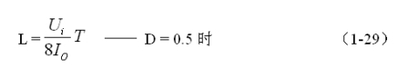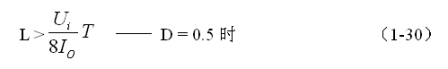 (1-29)和(1-30)式,就是計算反轉(zhuǎn)式串聯(lián)開關(guān)電源中儲能電感的公式。同理,(1-29)和(1-30)式的計算結(jié)果,只給出了計算反轉(zhuǎn)式串聯(lián)開關(guān)電源儲能濾波電感L的中間值,或平均值,對于極端情況可以在平均值的計算結(jié)果上再乘以一個大于1的系數(shù)。