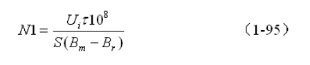 (1-95)式就是計(jì)算單激式開(kāi)關(guān)電源變壓器初級(jí)線圈N1繞組匝數(shù)的公式。式中,N1為變壓器初級(jí)線圈N1繞組的最少匝數(shù),S為變壓器鐵心的導(dǎo)磁面積(單位:平方厘米),Bm為變壓器鐵心的最大磁感應(yīng)強(qiáng)度(單位:高斯),Br為變壓器鐵心的剩余磁感應(yīng)強(qiáng)度(單位:高斯),Br一般簡(jiǎn)稱剩磁,τ = Ton,為控制開(kāi)關(guān)的接通時(shí)間,簡(jiǎn)稱脈沖寬度,或電源開(kāi)關(guān)管導(dǎo)通時(shí)間的寬度(單位:秒),一般τ取值時(shí)要預(yù)留20%以上的余量,Ui為工電壓,單位為伏。式中的指數(shù)是統(tǒng)一單位用的,選用不同單位,指數(shù)的值也不一樣,這里選用CGS單位制,即:長(zhǎng)度為厘米(cm),磁感應(yīng)強(qiáng)度為高斯(Gs),磁通單位為麥克斯韋(Mx)。