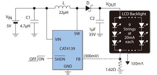 LED串的電壓通常為20V,在冷溫將會增加到23V(6×3.8V)。該電壓對于CAT4139這類組件過高。需要利用向CAT4240這類具有更高電壓的升壓型LED驅動器來驅動負載。CAT4240升壓LED驅動器的過壓檢測閾值為40V,適用于串聯(lián)燈數(shù)高達10只的LED串。