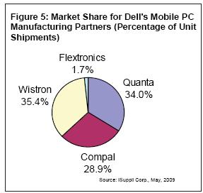 通常,Dell將個(gè)人移動(dòng)PC制造交予Wistron,將企業(yè)移動(dòng)PC制造交予Compal,Quanta則兩者兼有。圖中的數(shù)據(jù)顯示2008年Wistron為Dell完全制造的移動(dòng)PC的份額超過了50%。