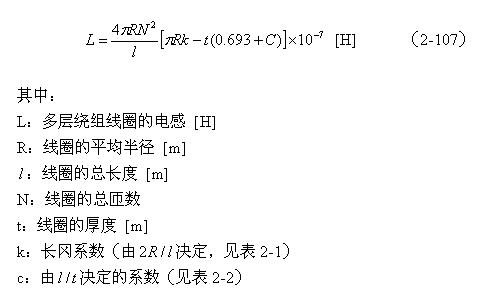 【說明】上式是用來計算多層線圈繞組、截面為圓形的空心線圈的電感計算公式。長岡系數(shù)k可查閱表2-1,系數(shù)c可查閱表2-2。當線圈內(nèi)部有磁芯時,有磁芯線圈的電感是空心線圈電感的