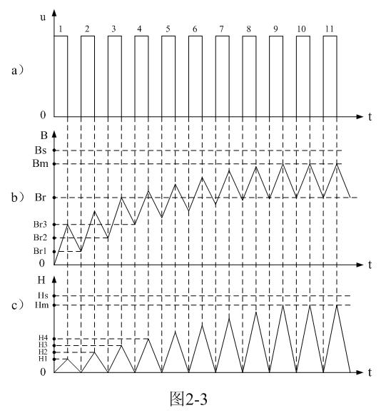 圖2-3是多個(gè)直流脈沖電壓連續(xù)加到變壓器初級(jí)線圈a、b兩端時(shí),輸入脈沖電壓與變壓器鐵芯中磁通密度B或磁通