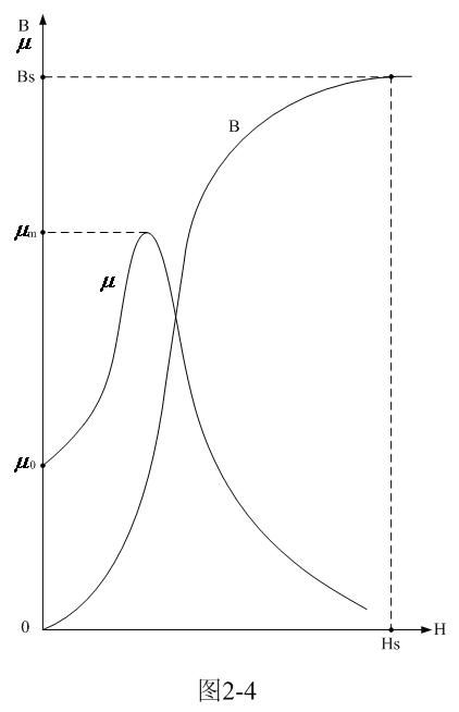 在圖2-4中,曲線B為磁通密度對(duì)應(yīng)磁場強(qiáng)度變化的關(guān)系曲線,曲線 為導(dǎo)磁率對(duì)應(yīng)磁場強(qiáng)度變化的關(guān)系曲線。由于我們這里把磁場強(qiáng)度作為自變量,而磁通密度和鐵芯導(dǎo)磁率都作為因變量,因此,我們同樣可以把曲線B和曲線 統(tǒng)稱為變壓器鐵芯的磁化曲線。
