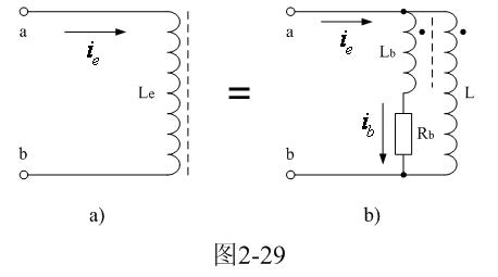圖2-29-a中,Le是一個(gè)同時(shí)考慮渦流損耗因素的電感;L是變壓器原初級(jí)線圈的電感;Rb是鐵芯渦流損耗電阻;Lb是一個(gè)互感線圈,通過它把流過電阻Rb的電流感應(yīng)到變壓器初級(jí)線圈中;當(dāng)流過電阻Rb的電流增加時(shí),流過通過Lb互感線圈的感應(yīng)作用,使流過變壓器初級(jí)線圈L的電流也同時(shí)增加。