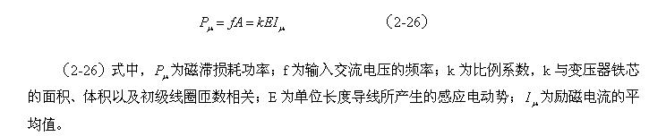 (2-25)式中,A為一個周期內(nèi)變壓器鐵芯的磁滯損耗,單位是焦耳;E為單位長度導(dǎo)線所產(chǎn)生的感應(yīng)電動勢,單位為伏; 為勵磁電流的平均值,單位為安培;T為輸入交流電壓的周期,單位為秒,f為脈沖頻率,或開關(guān)電源的工作頻率,單位為赫芝;k為比例系數(shù),它是一個與選用單位制和變壓器鐵芯面積、體積以及初級線圈匝數(shù)等參數(shù)相關(guān)的常量。在(2-21)、(2-22)、(2-23)、(2-24)式中,沒有比例系數(shù)k,是為了使問題簡單,便于分析。