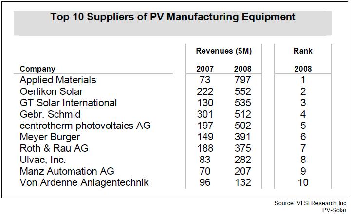 VLSI Research的數(shù)據(jù)顯示,Applied Materials全年晶體硅太陽能設(shè)備和薄膜太陽能設(shè)備收入總和達(dá)到了7.97億美元,超過了排在第二位的Oerlikon Solar,該公司收入額為5.52億美元。